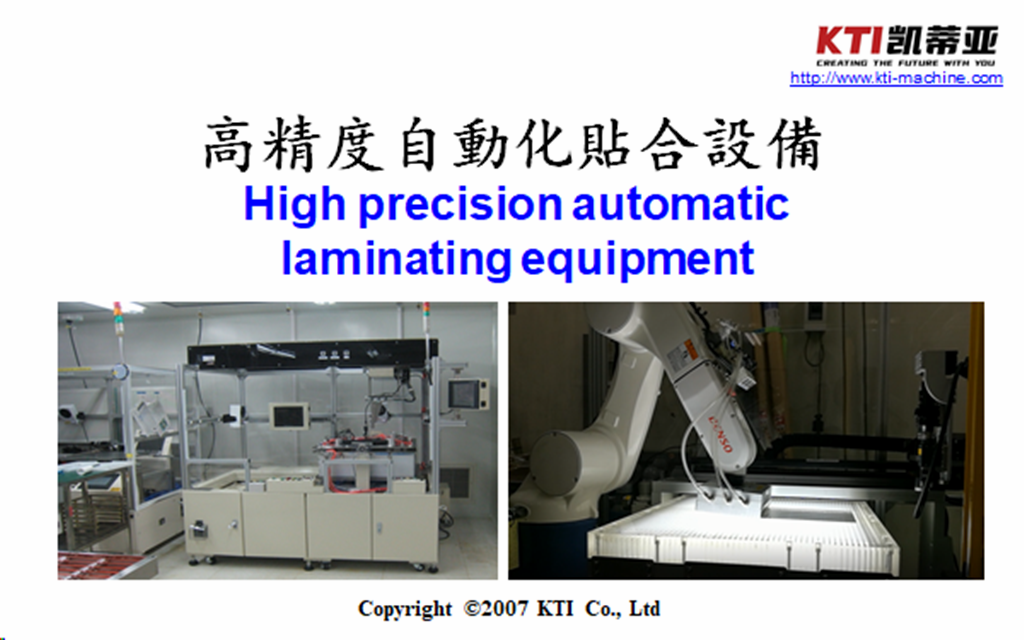 采用视觉认知技术,实现高精度机械定位控制,是KTI公司擅长的前沿技术之一。 大尺寸薄膜贴合设备,广泛地运用于显示器触摸屏制造,氢燃料电池传感器制造等领域。拥有多项独有的专利技术。